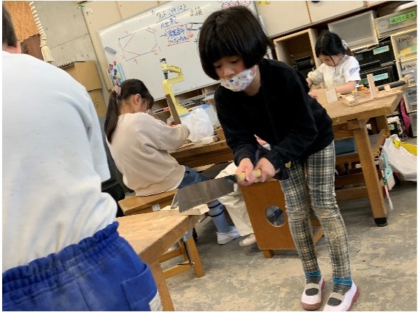 よくみると、それぞれが数人ずつのグループで、ノコギリ・ヤスリ・ペンやらを使って、いろいろなものを作っている! 「これは家に置く、置き物!」「家族へのプレゼント!」「家を作ってるんだ!」「何かわからないけど作ってる!」(←色々なものを組み合わせて素敵なオブジェみたいになっていました。)